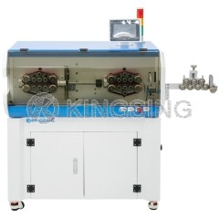 This machine also has the function of automatic lifting wheel and jump guide. The automatic lifting wheel means that the outgoing wire wheel can be opened automatically to avoid collision when stripping the wire head. The jump guide function means that the incoming wire guide can be lifted automatically to avoid collision when stripping the wire tail, which greatly increases the stripping length range.
