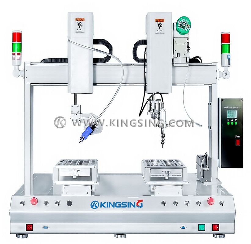 The system features two independent workstations, each equipped with its own Y-axis, Z-axis, and R-axis motion control. This fully independent XYZR control allows both processes to run simultaneously or independently, significantly improving overall productivity and manufacturing flexibility.
