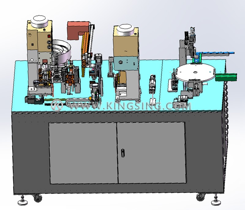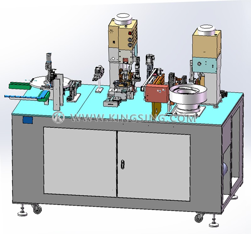 The machine can simultaneously handle two different wire colors, performing precise length cutting and double-end stripping. One end is crimped with a terminal and inserted into a connector housing, while the other end is crimped with a nickel plate terminal and automatically spot welded to the positive and negative poles of the battery.