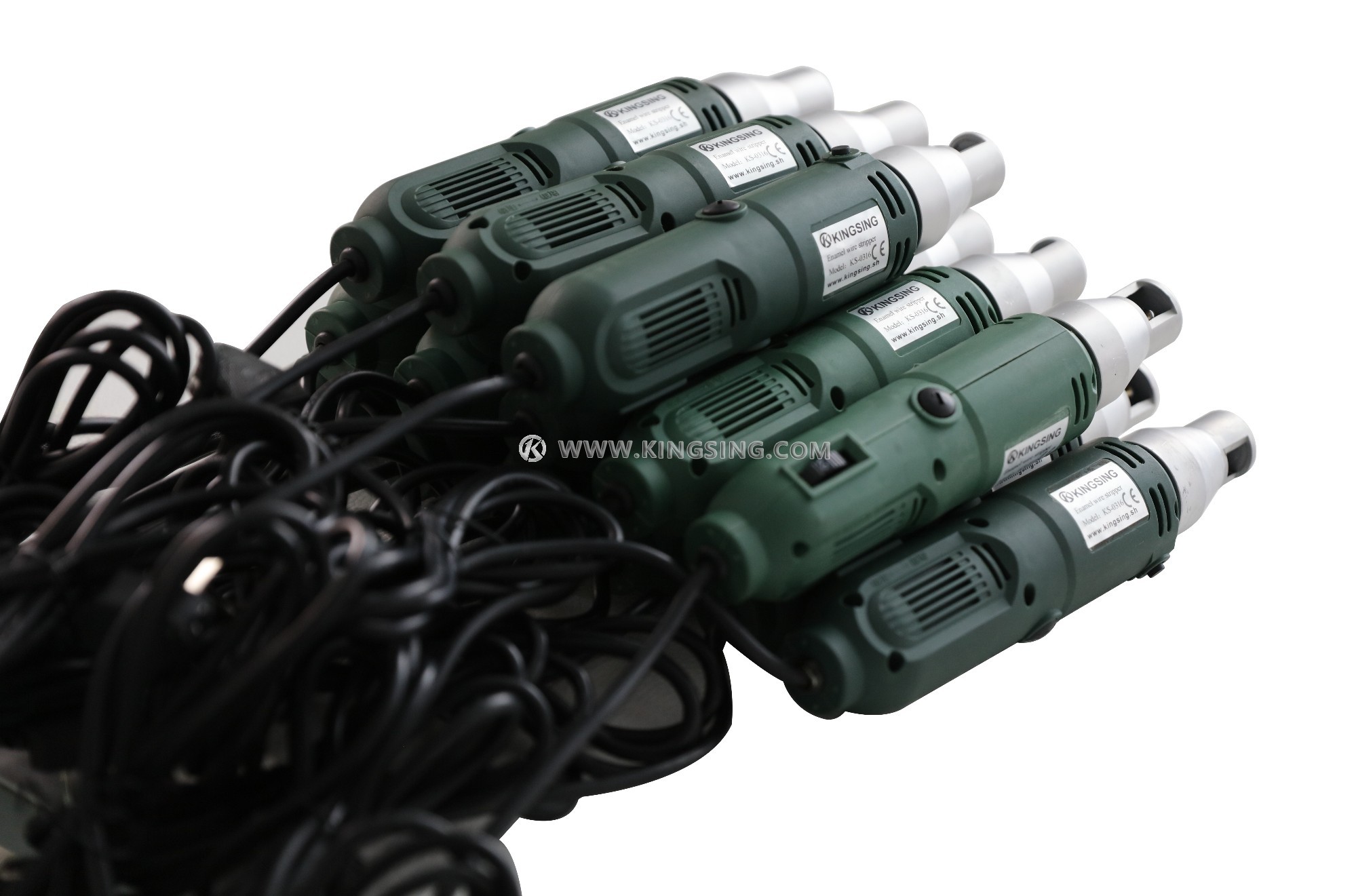 Hand-held enameled wire stripper KS-E513 is made up of electronic no-grade regulator, phase series motor and stripping blade. With portable and durable micro point switch and spinning type carbon brush and it has the following prominent advantages: high speed, high efficiency, easily operating, stability, easy installation, low failure rate, high production efficiency and novel design, and etc.