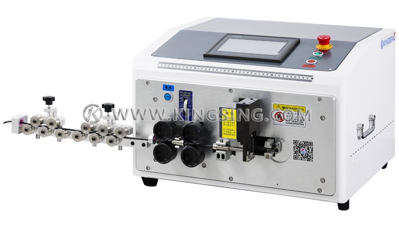 This is a fully automatic wire cutting, stripping and bending machine, which is specially designed for processing BV hard wires, and can process wires up to 16mm2. This machine uses 4 wire feeding wheels to feed the wire, which increases the contact area between the wire feeding wheel and the wire, which can prevent the wire from slipping between the wire feeding wheels and provide strong stripping power.